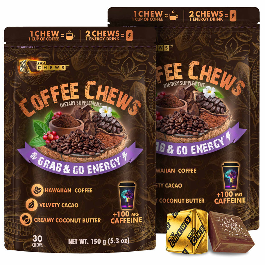 YouChews are crafted with the bold flavor of Hawaiian Kona Coffee, velvety cacao, and creamy coconut butter. Each vegan chew has a soft texture and contains 100mg of natural caffeine with just 2g of sugar for a quick energy boost